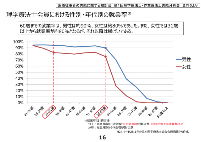 女性の理学療法士は31歳以上から就業率が約80%に低下しており、作業療法士、言語聴覚士においても同様の状況にある。これは結婚や出産、育児により常勤が困難となっていることが背景にある。