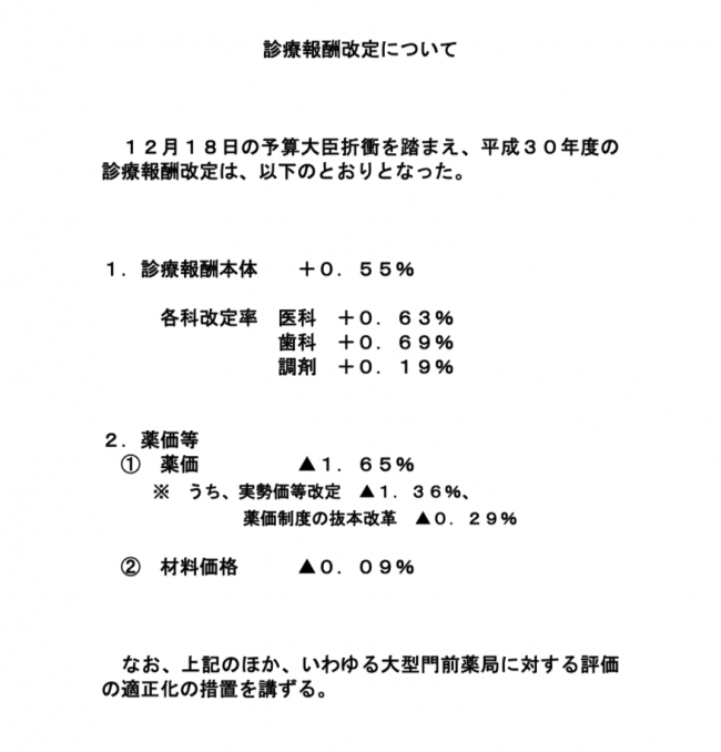 厚労省は18日、平成30年度の診療報酬・介護報酬・障害福祉サービス等報酬改定について発表。医師らの技術料や人件費に当たる診療報酬の本体部分は+0.55%、薬価は−1.65%。介護報酬は+0.54%の改定率となった。