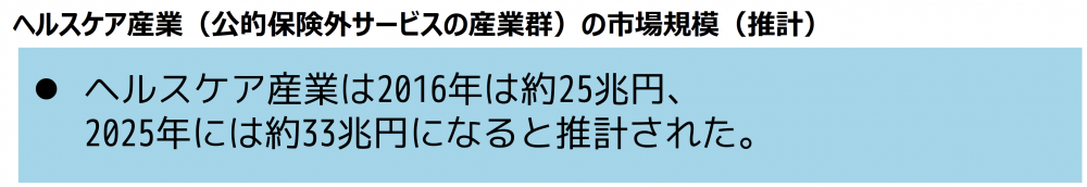 2018年5月14日付の日経新聞の見出しで「介護 周辺サービスも提供 厚労省、『保険外』併用の基準 事業者の収益増に道」と取り上げられた。ヘルスケア産業は2025年には約33兆円と市場が拡大すると見込まれている。