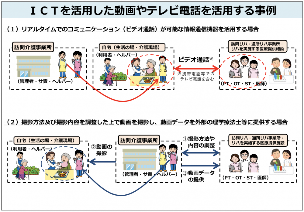 ① 訪問介護事業所のサービス提供責任者と外部の理学療法士等が、リアルタイムでのコミュニケーション(ビデオ通話)が可能な情報通信機器を用いて、外部の理学療法士等が利用者のADL及びIADLの状況を把握すること。なお、通信時間等の調整を行い、当該利用者の自宅(生活の場・介護現場)にてビデオ通話を行うこと。
