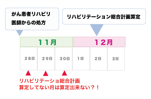 状況としては月末にリハオーダーが出て3日間(28日・29日・30日)がんに対するリハビリを実施し、がん患者リハビリテーション料患者を算定しました。リハビリテーション総合計画についてはカンファレンスや関連職種の調整が間に合わなかったため同月のリハビリテーション総合計画評価料の算定は出来ずに、翌月に算定を行うことになりました。しかし、保険者側は総合実施計画料が算定されていないためがん患者リハビリテーション料の算定不備として来ました。