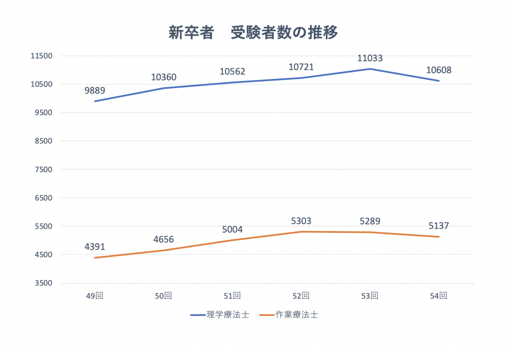 理学療法士の新卒者受験者数は近年増え続けていたが今年は425人減り、10,608人だった。