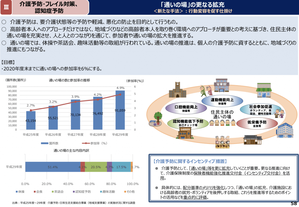 「健康寿命延伸プラン」の主な取組として、医療機関と保険者・民間事業者等の連携による医学的管理と運動プログラム等の一体的提供や、介護予防に資する「通いの場」の更なる拡充などが明記されている。「通いの場」に関しては、2020年度末までに参加率を6%にするとの具体的な数値目標が掲げられた。