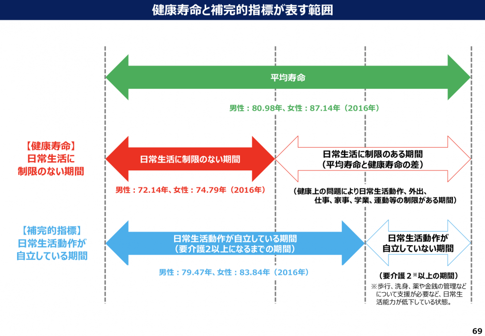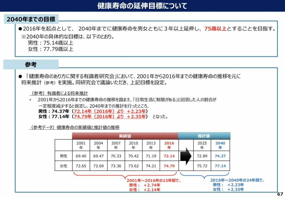 2040年までに健康寿命を男女ともに3年以上延伸し(2016年比)、75歳以上とすることを目指す「健康寿命延伸プラン」等が、2040年を展望した社会保障・働き方改革本部の資料で示された。