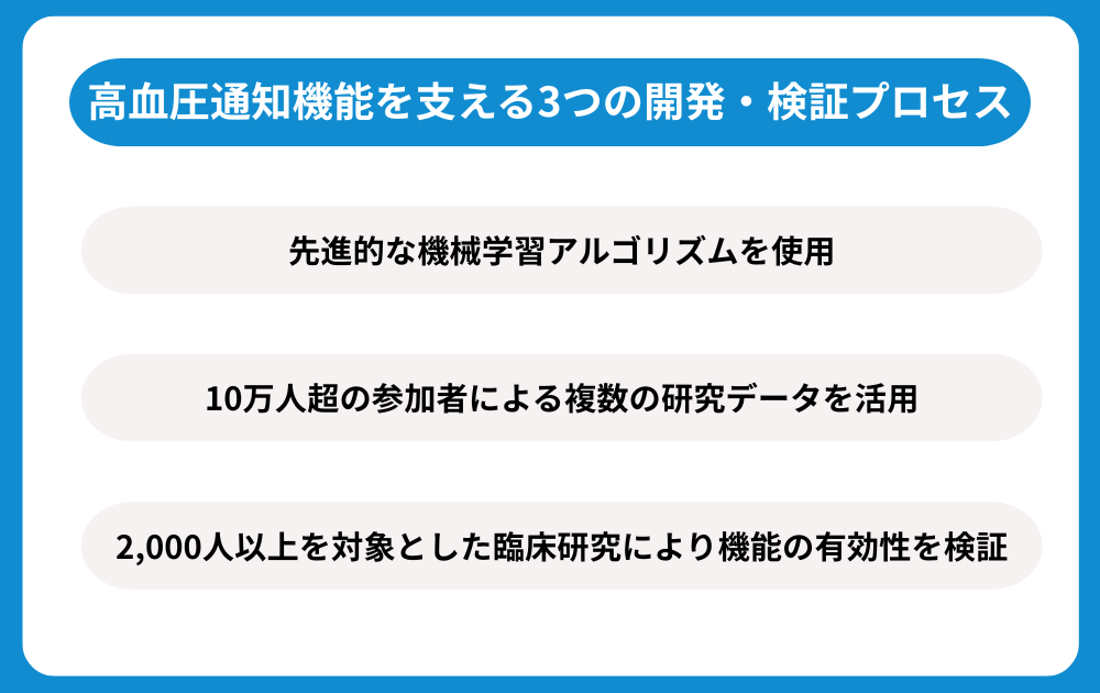 解析はユーザーの操作を必要とせず、日常生活の中で自動的に行われます。30日間にわたって蓄積されたデータを確認し、高血圧のパターンが一貫して見られた場合にのみ、通知が表示される仕組みです。